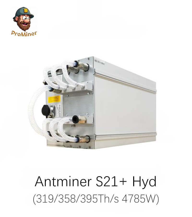The Antminer S21+ Hydro (319/358/395Th) from Bitmain mines the SHA-256 algorithm with a maximum hashrate of 395Th/s and energy efficiency of 15J/Th.